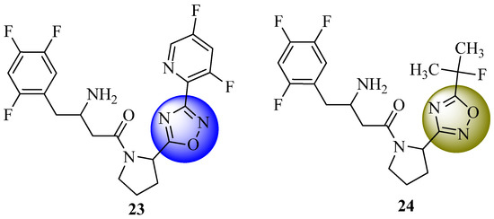 Nordhoff et al. [65] demonstrated that amide substitutions enhanced the absorption, distribution, metabolism, and excretion (ADME) characteristics of a series of β-homophenylalanine-based inhibitors of DPP-IV. Thanks to the efforts of this group, a new class of powerful and selective DPP-IV inhibitors with an appealing pharmacokinetic profile and good performance was synthesized and evaluated in an animal model of diabetes. Compounds 23 and 24 (Figure 15) from this new series of compounds were shown to display interesting pharmacokinetic properties and to work very well in animal models of diabetes.