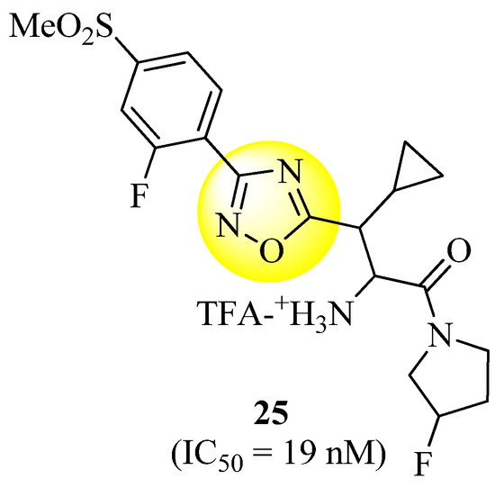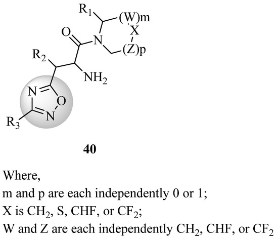 New 1,2,4-oxadiazole derivatives, whose structures were reported in the US patent issued by Xu et al. [72] (compound 40, Figure 21), are DPP-IV enzyme inhibitors and may be used to treat or prevent disorders involving this enzyme, such as diabetes, and more specifically type 2 diabetes. A pharmaceutical composition including these compounds and their application in the prevention or treatment of illnesses involving the DPP-IV enzyme are also contemplated by this invention.