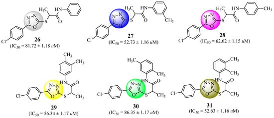 N-aryl/aralkyl derivatives of 2-methyl-2-{5-(4-chlorophenyl)-1,3,4-oxadiazole-2-ylthiol}acetamides were synthesized and the α-glucosidase inhibitory potential of each drug was examined. Compounds 26–31 (Figure 17) displayed a strong α-glycosidase inhibitory activity (IC50 of 81.72 ± 1.18, 52.73 ± 1.16, 62.62 ± 1.15, 56.34 ± 1.17, 86.35 ± 1.17, 52.63 ± 1.16 µM, respectively). These results were validated by molecular modelling and ADME predictions. It was then possible to synthesize a library of compounds using ordinary basic materials possibly leading to the development of new medicines [67].