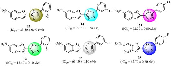 Taha et al. [69] designed and synthesized twenty 5-aryl-2-(6′-nitrobenzofuran-2′-yl)-1,3,4-oxadiazole derivatives and tested them for their ability to inhibit α-glucosidase. Compared to acarbose (IC50 = 856.45 ± 5.60μM), compounds with hydroxyl groups and halogens (compounds 33–38, Figure 19) were shown to be five to seventy times more active, with IC50 values in the range of 12.75 ± 0.10 to 162.05 ± 1.65 μM. A hybrid family of oxadiazole and benzofuran compounds is now being studied for its ability to block α-glucosidase. Researchers may be prompted to use these results for the treatment of hyperglycemia. Within docking studies, hydrogen bonds and arene–arene interactions were shown to be the primary means of interactions with Glu 276, Asp 214, and Phe 177.