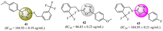 Hamdani et al. [73] synthesized three 1,3,4-oxadiazole derivatives (compounds 41, 42, and 43, Figure 22) and used X-ray diffraction, density functional theory (DFT), and other methods to demonstrate their inhibitory potential of α-amylase. X-ray diffraction and other spectro-analytical methods were employed to validate the structures of the obtained compounds, which were prepared in excellent yields (70–83%). In addition to validating X-ray data, DFT calculations also examined charge dispersion and reactivity, utilizing frontier molecular orbitals and molecular electrostatic potential (MEP) approaches. α-amylase inhibition experiments were used to determine the enzymatic inhibitory capacity of the produced compounds (41, 42, and 43). Compound 42 displayed a low IC50 value of 86.83 ± 0.23 μg/mL, which indicates its strong ability to inhibit α-amylase.