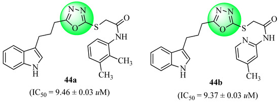 In order to investigate the sequential conversion of indolyl butanoic acid into 1,3,4-oxadiazole-2-thiols, Nazir et al. [75] employed several chemical transformations. Several different amine derivatives were reacted with 2-bromoacetyl bromide to serve as an electrophile, leading to the production of 2-bromo-N-phenyl/arylacetamides in a series of operations that ran in parallel with one another. A nucleophilic 1,3,4-oxadiazole-2-thiol analogue was then applied to the electrophilic compounds to produce a variety of N-substituted derivatives (compounds 44a and 44b, Figure 23). In this study, the anti-diabetic potential of all produced compounds was first examined through the inhibition of the α-glucosidase enzyme, and then by studying them in silico. In addition, their hemolytic activity was used to determine their cytotoxicity profile, and all of the compounds were shown to display minimal cytotoxicity. The most active compounds (44a and 44b) had IC50 values of 9.46 ± 0.03 µM and 9.37 ± 0.03 µM, respectively. As a result, they may serve in future studies to develop more efficient anti-diabetic drugs, as they showed excellent to moderate inhibitory potentials (IC50 = 12.68 ± 0.04 to 37.82 ± 0.07 µM, respectively).