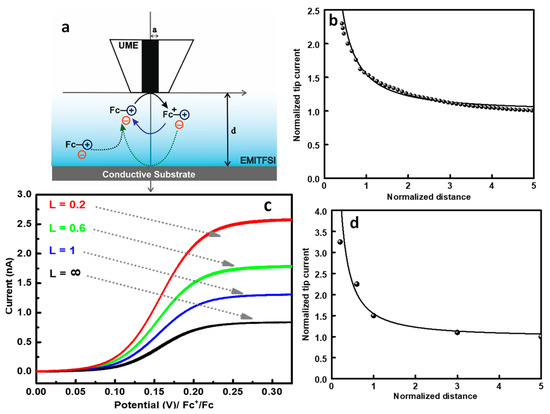 (a) Scheme illustrating the SECM feedback over a conducting substrate. (b) Approach curve recorded on Pt UME in 10 mM of Fc-IL in [EMIm+][TF2N−] solution (dot) experimental curve, (solid line) theoretical curve. (c) Cyclic voltammograms at different distance tip-substrate (L = d/a): (black) L = ∞, (blue) L = 1, (green) L = 0.6, (red) L = 0.2. (d) Reconstructed approach curve from the steady-state CV at a potential 0.3 V vs. Fc+/Fc.