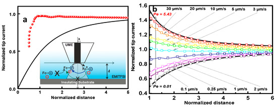 The cyclic voltammograms at different scan rates offer the real behaviors of the redox species in the vicinity of the microelectrode. Finally, a more reliable approach curve by eliminating the contribution of the convection is reconstructed using the steady-state current observed during the chronoamperometry, at 0.4 V vs. Fc+/Fc during 50 s, at different tip-substrate distance. Interestingly, the variation of the normalized current iT/i∞, as a function of the normalized distance tip-substrate, is plotted as shown in the Figure 3b. The evolution of the normalized current matches perfectly with the theoretical approach curves, which are calculated under steady-state conditions. This result shows the possibility to record approach curves in ionic liquid under diffusion control.