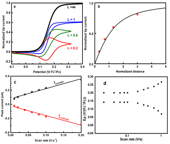 To get further insight, the CVs at different tip-substrate distances were recorded, as shown in Figure 3a. Far from the substrate, typically tip-substrate distance higher than 3a, steady-state CV is obtained, indicating that the mass transport is controlled by the radial diffusion.