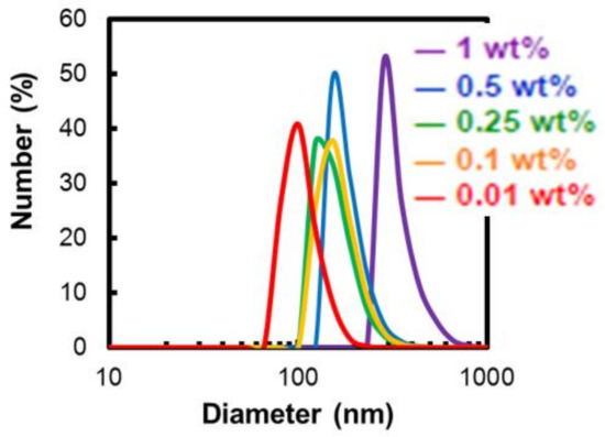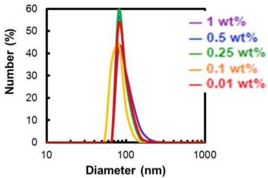 The DLS study of the dependence of the micelle diameter on the alky chain length and polymer concentration revealed that the micelle size of poly(octyloxyethylene phosphate) (Table 5 and Figure 1) became larger with increasing concentration, while in the case of poly(decyloxyethylene phosphate), micelles were stable even at 1 wt% (Table 5 and Figure 2). The size of the micelles using poly(dodecyloxyethylene phosphate) was also stable regardless of the concentration. However, there was some variation compared to poly(decyloxyethylene phosphate) micelles (Figure 3). In addition, it can be large at concentrations above 1 wt%.
