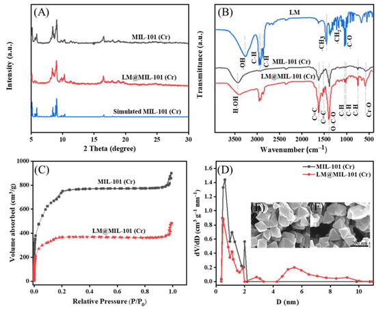 (A) XRD patterns; (B) FT-IR spectra; (C) N2 adsorption/desorption isotherms; (D) pore-size distribution; (E,F) SEM images of LM and LM@MIL-101 (Cr).