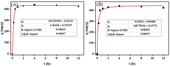 Adsorption kinetic model fitting results of menthol on MIL-101 (Cr): (A) pseudo-first-order kinetic model; (B) pseudo-second-order kinetic model.