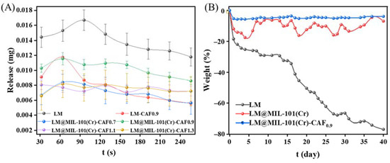CAF was coated onto LM@MIL-101 (Cr) through a solution-mediated process. CAF was selected for coating due to its high stability and excellent biocompatibility. The thermally triggered release of LM from LM@MIL-101 (Cr)-CAF with different CAF amounts was surveyed (Figure 5A). In order to protect LM from diffusion under storage conditions, LM@MIL-101 (Cr) was further coated with cellulose acetate fiber (CAF). The release performance of LM from CAF coated LM@MIL-101 (Cr) with different CAF amounts (abbreviated as LM@MIL-101 (Cr)-CAFx, where x denotes the weight of CAF used in grams) was evaluated. To test the sealing property of CAF, the pore structure of LM@MIL-101 (Cr)-CAF0.9 was characterized using N2 adsorption/desorption experiments. In Figure S1, N2 adsorption/desorption isotherms and pore-size distribution maps show that it contained very few pore structures. The BET surface area was only 74.06 m2 g−1. Moreover, the total pore volume was only 0.0509 cm3 g−1. Thus, it could be proved that the material surface was almost entirely cellulose acetate fiber, and LM was sealed inside the cellulose acetate fiber membrane. The heat-release temperature of 250 °C was selected for this experiment because such a temperature is relevant for many applications, such as the release of fragrance from tobacco. The amount of LM released in different systems is shown in Table S4. Pristine LM showed the highest release amount. When LM was coated with CAF, its release amount significantly decreased. This result indicated that the CAF shell increased the resistance for LM release. It could be clearly seen that the release rate of LM@CAF0.9 rapidly increased after 32 s. In contrast, the release rate of LM was significantly lower for LM@MIL-101 (Cr)-CAF. In the LM@MIL-101 (Cr)-CAFX series, LM@MIL-101 (Cr)-CAF0.9 had the highest value of 0.082 mg, which reached 74.9% of that for pristine LM under identical conditions (Table S4). LM release was greatly reduced when the content of CAF was lower than 0.9 g. This could have been because the amount of CAF was insufficient for the complete coating of LM@MIL-101 (Cr). The quantity of LM released also decreased with the increase in CAF when the CAF content was greater than 0.9. This was understandable, because excess CAF coating posed higher diffusion resistance for LM.