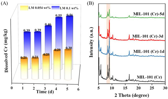 (A) Dissolved chromium ion over time when MIL-101(Cr) is dispersed in physiological saline solutions and (B) XRD patterns of MIL-101(Cr) soaked in saline solution for different times.