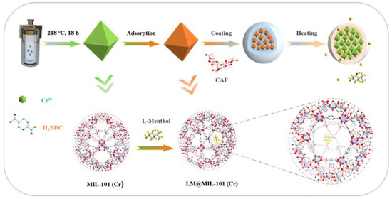 Metal-organic frameworks (MOFs) are porous crystalline materials with a periodic network structure formed by the self-assembly of transition metal ions and organic ligands and have been widely employed in adsorption-related fields, such as hydrogen storage and the selective absorption of carbon dioxide and methane from air [14,15,16], due to their high stability, flexible structure and inherent affinity toward specific molecules. MOFs have also been used to remove heavy metals and dyes from water [17,18]. In addition, some MOFs, such as the MIL series, exhibit excellent acid and alkali resistance and high thermal stability [19,20]. The chemical stability of MILs is associated with the inertness of the central metal atom, while their thermal stability is related to the strength of the metal bond [20,21,22]. Furthermore, MILs normally have a large specific surface area, which makes them excellent candidates for adsorption-related applications. In this work, we designed a composite fragrance host based on cellulose acetate fiber membrane (CAF)-coated MIL-101 (Cr). L-menthol, a widely used fragrance, was selected as a model fragrance for the evaluation of the adsorption/release performance of the host.