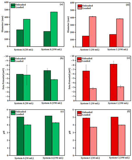 Figure 1 shows the evaluation of particle size (nm), zeta potential (mV) and pH of Systems A and C. Considering System A, Figure 1a shows a loaded particle diameter increasing around 25.96%, while the diameter of the unloaded particles decreased by 10.37%. Figure 1b shows the increase in zeta potential in the unloaded particles, and Figure 1c shows pH variations between 2.57% and 6.96%, respectively, in loaded and unloaded systems. Considering System C, Figure 1d shows an increase in diameter of around 14.45% in unloaded particles, while the loaded systems presented a reduction of 7.17% in diameter. Figure 1e shows the increase (in module) in zeta potential by around 22.71% and 14.80%, respectively, in unloaded and loaded nanoparticles. Finally, Figure 1f shows that the basicity was increased by 2.45% and 7.56%, respectively, in the unloaded and loaded particles.