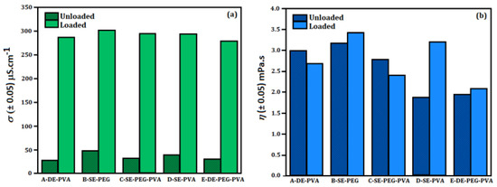 (a) Electrical conductivity (σ) and (b) dynamic viscosity (η) of System A (A–DE–PVA), System B (B–SE–PEG), System C (C–SE–PEG–PVA), System D (D–SE–PVA) and System E (E–DE–PEG–PVA).
