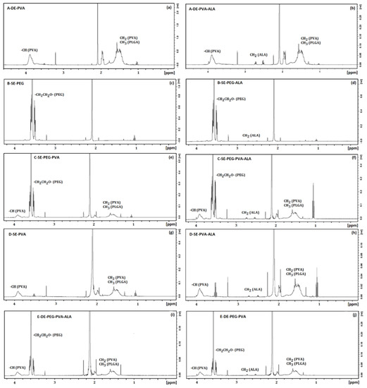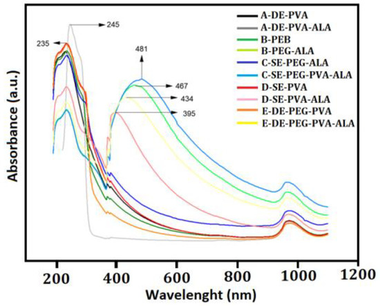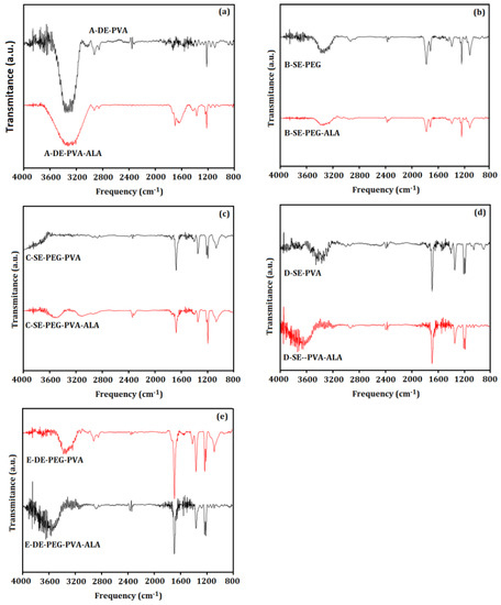 Figure 5 shows the FTIR spectra of System A (A–DE–PVA and A–DE–PVA–ALA), System B (B–SE–PEG and B–SE–PEG–ALA), System C (C–SE–PEG–PVA and C–SE–PEG–PVA–ALA), System D (D–SE–PVA and D–SE–PVA–ALA) and System E (E–DE–PEG–PVA and E–DE–PEG–PVA–ALA).