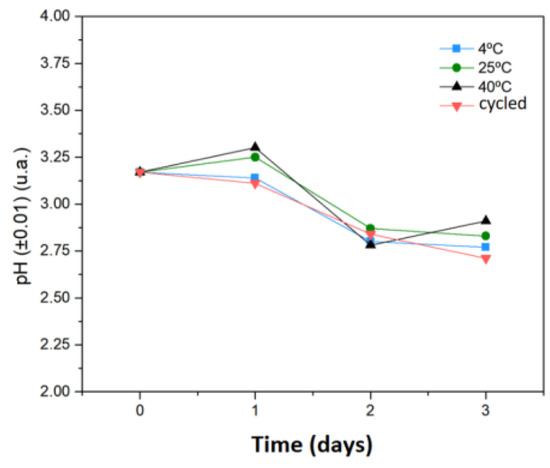 A solution of ultrapure water (50 mL; 0.4472 mg.mL−1) and 5-ALA was prepared. This solution was divided into pharmaceutical glass vials and stored at (23.0 ± 2.0) °C, (5.0 ± 1.0) °C, (40.0 ± 2.0) °C and cycled (24 h stored at (5.0 ± 1.0) °C and 24 h at (40.0 ± 2.0) °C). The pH measurements were performed for four consecutive days in triplicate.