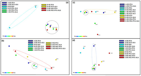 (a) IDMAP maps for zeta potential analysis; (b) IDMAP maps for pH analysis; (c) IDMAP maps for the particle size and (d) IDMAP maps for the PDI of System A (A–DE–PVA and A–DE–PVA–ALA), System B (B–SE–PEG and B–SE–PEG–ALA), System C (C–SE–PEG–PVA and C–SE–PEG–PVA–ALA), System D (D–SE–PVA and D–SE–PVA–ALA) and System E (E–DE–PEG–PVA and E–DE–PEG–PVA–ALA) showing the similarities of the proximity systems.