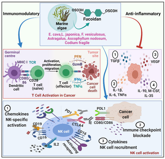Fucoidan remodels the immune system to improve the sustainability of cancer-specific T cells and NK cells and results in the elimination of cancer cells. Crude and modified fucoidans have been proven to have immunopotentiating effects in tumor-bearing mice, resulting in antitumor efficacy [27,53]. Several studies have confirmed crude fucoidan’s profound cell survival and natural killer activity in vitro and in vivo [82]. Farzaneh et al., 2015 found that fucoidan limits the development of promyelocytic leukemia cells in vitro and in vivo by boosting the cytotoxic activity of NK cells and delaying tumor formation [40]. In line with this, fucoidan reduced cell proliferation in Huh7 human liver cancer cells more effectively by inhibiting the chemotaxin CXCL12 and CXCR4 pathway, an effective target for cancer therapy [54]. Fucoidan has a strong anti-inflammatory activity; however, the underlying mechanisms exerted by fucoidan have not been fully elucidated. Fucoidan has been shown to impede lymphocyte adhesion and invasion, enzyme inhibition, and induce apoptosis at various phases of the inflammatory process. The downregulation of MAPK and NF-B signaling pathways, as well as selectins and the concomitant decrease in the generation of proinflammatory cytokines, is the most often debated putative mode of action for fucoidan [83,84].