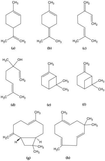 Structures of the investigated compounds: (a) limonene, (b) terpinolene, (c) myrcene, (d) linalool, (e) α-pinene, (f) β-pinene, (g) β-caryophyllene, (h) humulene.