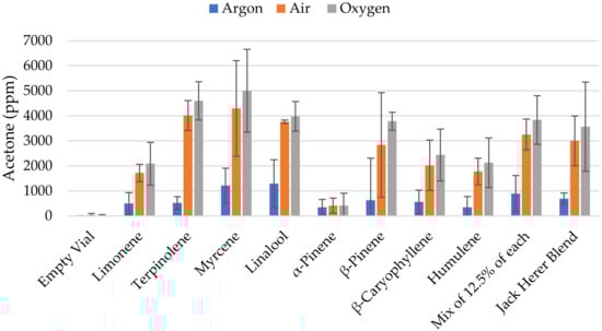 In the first experiment, samples of pure compounds—as well as two mixtures—were analyzed in an argon, air, or oxygen atmosphere. This analysis was performed on three separate days. The average and the 95% confidence intervals can be found in Figure 2. With the notable exception of α-pinene, a higher amount of acetone is found in samples analyzed in air or oxygen versus samples containing an argon-enriched atmosphere. In all cases—except for β-pinene in argon vs. air— the difference is significant at a 95% level (see error bars). However, we found no significant difference between the samples purged with oxygen versus the samples purged with air alone.