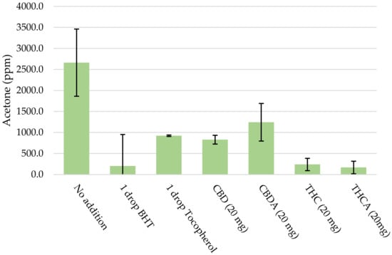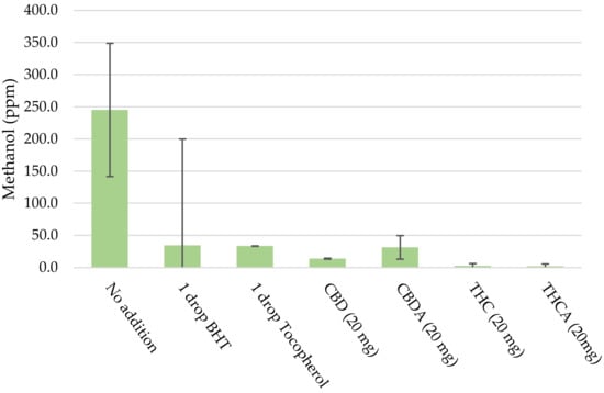 To investigate the influence of oxygen a second experiment was conducted. In this experiment, the blend with equal ratios of terpenes was used and a small amount of either BHT, tocopherol, cannabidiol (CBD), cannabidiolic acid (CBDA), tetrahydrocannabinol (THC), or tetrahydrocannabinolic acid (THCA) was added. This experiment was conducted in duplicate, and the average and the 95% confidence interval are plotted for acetone (Figure 3) and methanol (Figure 4). This data shows that the addition of the mentioned compounds results in a significant reduction in the amount of acetone that is detected. The data was significant at a 95% level for all compounds. A similar decrease can be found in the amount of methanol that is detected and was significant at the 95% level for all compounds except BHT.