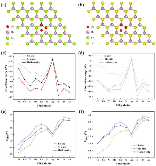 The stability of the SACs can be verified from the adsorption energy of various TMs anchored on MoSSe and the dissolution potential (Udiss, vs. SHE); both ensure the stability of the TM@MoSSe under an electrochemical environment [29,30].
