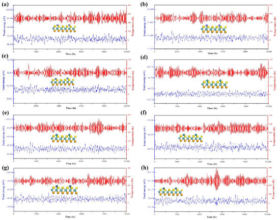 Variations of temperature and energy of against the time for the AIMD simulations of (a) Fe, (b) Co, (c) Ni, (d) Ru, (e) Rh, (f) Pd, (g) Ir, and (h) Pt@MoSSe. The simulation was run under 500 K for 10 ps with a time step of 1 fs.