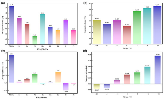 The OER overpotential of (a) TM@MoSSe and (b) Ni@MoSSe under different strain; the HER overpotential of (c) TM@MoSSe and (d) Fe@MoSSe under different strain.