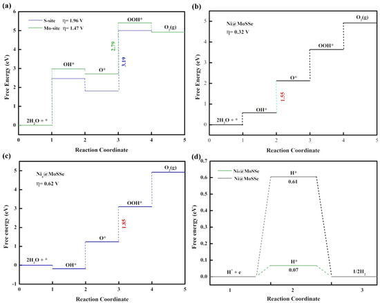 The OER performance of the original MoSSe was calculated by considering two different reactive active sites (i.e., the Mo atom site on the S side and the Mo atom site on the Se side). As shown in Figure 4a, the calculated Gibbs free energy of the four-step OER reaction process showed that the OER overpotential was 1.96 V at the Mo atom site on the S side and 1.47 V at the Mo atom site on the Se side. In the third step, the energy required for the reaction of O* with OH* to generate the intermediate of HOO* was the largest. This step is a key step to determine the overpotential of the electrocatalytic oxygen evolution reaction on MoSSe. The large overpotential indicated that the catalysis activity of MoSSe needs to be improved, and MoSSe without any surface modification is not an excellent electrocatalytic material that can replace precious metals.