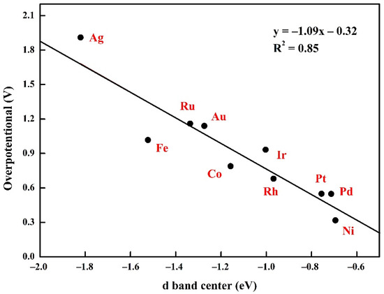 For metal catalysts, the active element composition, chemical state, size, and the crystal structure of all sorts of complicated factors, such as extremely subtle structure change, can bring huge performance change. Therefore, it is very difficult to adjust the performance of the metal catalyst. According to the d-band center theory, the d-band center of a series of TM@MoSSe metals was explored and fitted with overpotential. It was found that there was a good linear relationship between the d-band center and material OER overpotential (R2 = 0.85), as shown in Figure 5. In the TM@MoSSe system, the stability and activity of the catalysts are improved and the OER overpotential of the materials is decreased with an increase of the binding strength between the transition metals and the MoSSe surface.