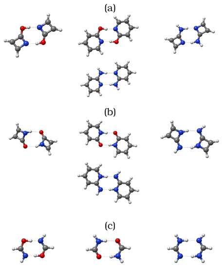 Aromaticity is a multi-factorial concept which is thought to modify and even to determine the structural, energetic, electronic, and magnetic properties of some molecules. Due to lack of an inherent Dirac observable defining it, aromaticity is usually described in terms of its effects on conjugated systems, such as enhanced thermodynamic stability or structural rigidity. Although the idea of aromaticity was conceived solely upon the interpretation of experimental results, the birth of quantum and computational chemistry motivated the development of multiple tools and techniques aiming at its quantitative analysis. One of the most common approaches to study and measure aromaticity is the nucleus-independent chemical shifts (NICS) [46,47] method, as originally proposed in 1996 by Schleyer and coworkers [46]. The NICS approach has been used for several decades to study numerous skeletons in a variety of fields. Nevertheless, some results obtained through the NICS descriptor have turned to be highly questionable [48,49,50], even contradicting, in some cases, other aromaticity measures based on reactivity [51]. Among many other criteria exploited to quantify aromaticity we can find (i) structural indices, which evaluate bond equalisation [52], (ii) energy decomposition analyses which require a reference molecule [53], and (iii) electronic descriptors which evaluate the amount of electron delocalisation among the atoms forming a cyclic structure. The last-mentioned set includes a number of methods that have been developed relying on the partition of the electronic density offered by QTAIM, such as the Para Delocalisation Index (PDI) [54], the Aromatic Fluctuation Index (FLU) [55], or the Multicenter Index (MCI) [56]. The PDI and FLU approaches provide an estimate of the aromaticity of a system in terms of the electron delocalisation within the cyclic skeleton, whereas the MCI method arises from a generalised population analysis leading to a many-atoms bond index. In the present work, we have made use of some electronic delocalisation-based descriptors, such as the MCI or the FLU indices, to quantify the changes in aromaticity and antiaromaticity of each molecule upon the formation of the corresponding dimer. We have chosen the FLU and MCI indicators to account for the changes in aromaticity and antiaromaticity upon interaction of the monomers under consideration given their proven accuracy and reliability [57]. Furthermore, these methods are fully compatible with the rest of the QCT analyses performed in this report. Unfortunately, the PDI method is not applicable to some of the examined systems herein, because it can only be used for six-membered rings. Finally, we also used the IQA partitioning to study in detail the energetic changes accompanying the generation of the molecular clusters shown in Figure 2, with a particular emphasis on their role in HB formation.