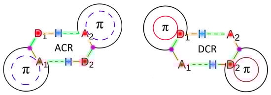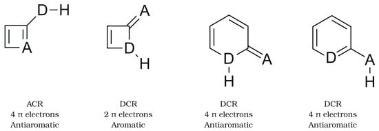 This last observation is fulfilled for all the systems and suggests that the formation of the dimers may trigger two opposed effects. Because the A–C bond is contained within the ring in ACR dimers, and DI(C–A) < 0 as indicated in Table 3, we would expect that the formation of the H-bond would decrease the number of electrons in the associated ACR cyclic structures as represented in Figure 4. On the contrary, the D–C bond is included in the cyclic structures of DCR dimers, and DI(D–C) > 0 (Table 3), then the number of electrons must increase in the DCR dimers due to the formation of the H-bond. Accordingly, Table S8 indicates that the group energy of the ACR/DCR rings increase/decrease upon the formation of the corresponding dimers. These changes in electron delocalisation affect the aromaticity and antiaromaticity of the investigated systems as discussed below.
