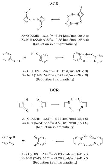 Alternative interpretation of the AMHB in the DCR dimers compared to that offered in Figure 6 as increases in aromaticity and antiaromaticity in the (i) 2HP and 2AP on one hand and (ii) the AZA and AZH on the other, respectively.