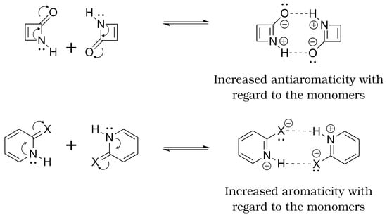 Another particularly relevant interplay between H-bonds and systems can be found in the case of the more recently proposed Aromaticity and Antiaromaticity Modulated Hydrogen Bonds (AMHB) [31,32]. The concept of AMHB was first introduced to rationalise the apparent strengthening or weakening of HB interactions modulated by changes in aromaticity and antiaromaticity in the involved systems. Although clearly intuitive and useful, the ideas of aromaticity and antiaromaticity are built upon elusive and ill-defined chemical concepts, which hinder a quantitative and rigorous analysis. Fortunately, state-of-the-art wave function analysis methods have proved very useful in the study of electron delocalisation, which is a critical aspect in the study of aromaticity and antiaromaticity. In particular, and in the context of Quantum Chemical Topology (QCT), the Quantum Theory of Atoms in Molecules (QTAIM) [33] and the Interacting Quantum Atoms (IQA) [34] methods have been successfully exploited to investigate the mutual influence of HBs and systems [22,23,24,25].
