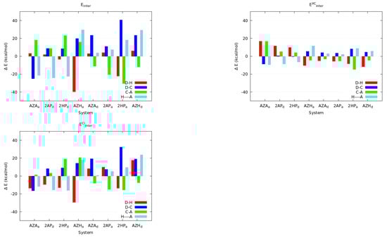 In short, we observe that the condition , i.e., a more favourable formation of the HB with respect to the reference is related with a reduction in the antiaromatic character of the monomers. Correspondingly, when , i.e., a less favourable HB with respect to the reference is accompanied by a reduction of the aromaticity of the monomers. These observations based on QCT are consistent with those of Wu and coworkers [32]. We note some flexibility in the interpretation of these results. Namely, the decrease in aromaticity in the HB formation of the AZA and AZH dimers in DCR configuration was interpreted in Reference [32] as an intensification of antiaromaticity (Figure 7). Similarly, the decrease in antiaromaticity of the DCR systems 2HP and 2AP after the generation of the corresponding dimers was interpreted as an HB reinforced by an increase in aromaticity [32]. This observation suggests that aromaticity and antiaromaticity can be put in a similar scale using electron delocalisation tools within the conceptual framework of QCT.