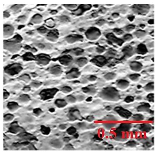 A surface and cross-section were prepared for the pumice’s pore size distribution. Micrographs were taken on a Nikon binocular microscope supported by a high-resolution digital canon camera; the micrographs were taken at a magnification ranging from 40× to 60× Figure 1. The images were manually corrected using Photoshop CS5 (Adobe) to remove any dark parts and obvious debris. Pore count and pore size were determined in 1 cm2 using a particular counting stage.