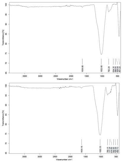 IR spectra of pumice (A) before reaction and (B) after reaction for five-time reaction cycles.