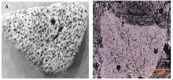 Photograph of pumice samples. (A) Photograph of a hand-specimen; (B) photomicrograph under a transmitted microscope.