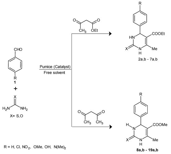 A mixture of aromatic aldehyde (e.g., benzaldehyde (10 mmol, 1.06 g), p-chlorobenzaldehyde (10 mmol, 1.46 g), p-nitrobenzaldehyde (10 mmol, 1.51 g), p-methoxybenzaldehyde (10 mmol, 1.36 g), N,N-dimethylaminobenzaldehyde (10 mmol, 1.49 g) or 4-hydroxybenzaldehyde (10 mmol, 1.22), ethyl acetoacetate (15 mmol, 1.95 mL) or acetyl acetone (15 mmol, 1.54 mL), and urea (11 mmol, 0.66 g)/thiourea (11 mmol, 0.84 g) was heated at 180°C while stirring (under solvent-free conditions) in the presence of pumice catalyst (0.4 g) for 1–3 min. After completion of the reaction, the hot reaction mixture was poured into 10 mL ethanol. The catalyst was recovered in this case as solid precipitate, which was directly filtered. The filtrate was kept at room temperature for a few hours, and the formed precipitate was filtered to yield the desired products.