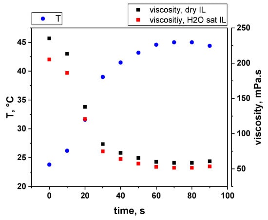 Temperature evolution of the sonicated dry [BEPip][NTf2] and corresponding calculated values of the viscosities of dry and water-saturated IL.