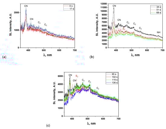 SL spectra obtained in the very first minutes of sonication; indicated times stand for the beginning of the corresponding spectrum (water-saturated [BEPip][NTf2] IL, 20 kHz, Ar): (a) 0 and 17 s, (b) 51 and 68 s, (c) 85, 102, 119 and 136 s.