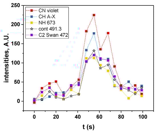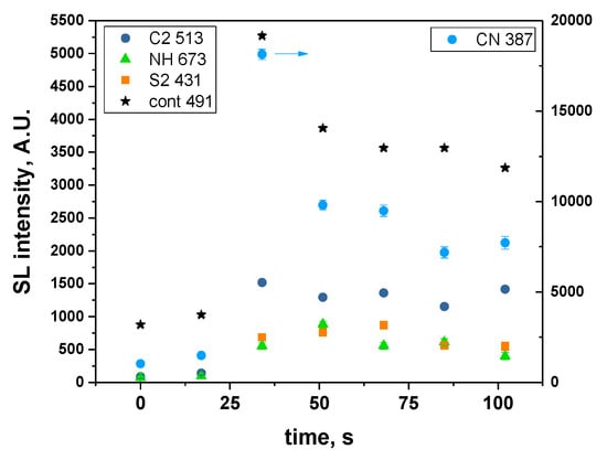 Figure 8 presents the SL spectra measured at 41 s and 48 s, whereby the latter corresponds to the maximum intensity of SL. The same molecular emissions as those obtained with a 17-s time resolution can be observed, although they are less intense, and include C2 Swan bands, CN violet, CH A-X, the second order emission of NH A-X and S2 B-X. The time evolution of these molecular emissions (Figure 9) follows approximately the same trend as that of the SL continuum with two local maxima, at around 14 s and 55 s. This correlation can be explained by an increase in the number of active bubbles, at the interface of which the IL can be thermally degraded, and possibly leading to an increase in the number of bubbles that present droplet injection. Evidently, the proportionality is not exact (Figure S2); the jetting bubbles will contribute more to molecular emissions, while spherically collapsing bubbles emit a stronger continuum [31].