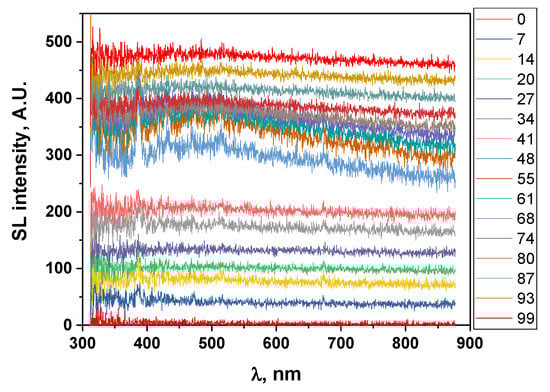 A very dry IL was then used to increase the SL intensity to its maximum so as to decrease the acquisition time as much as possible. To monitor in more detail the evolution of the SL continuum and the molecular emissions within the first minute of sonication, the acquisition time was reduced to a minimum (5 s) and no averaging was performed. Evidently, this leads to a larger scatter in the signal. Figure 6 presents the evolution of the corresponding SL spectra in the first moments of sonication. For clarity, to avoid superimposition, the spectra in Figure 6 were plotted in the stack mode, i.e., shifting them on the y-axis.