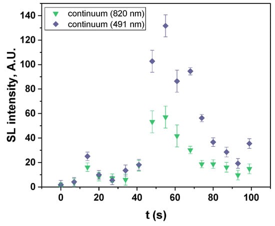 In general, the observed phenomena display (much) faster kinetics than in our previous study [10], where the continuum intensity was observed to decrease only after 5 min of sonication. This different behavior is due to the difference in the initial temperature. Indeed, the initial temperature is higher in the present study compared to the previous one (25 °C vs. 1 °C), resulting in a 6-times lower initial IL viscosity according to Equation (1). The subsequent higher number of cavitation bubbles in the first seconds of sonication leads to the faster degradation of the IL; a strong decrease in the SL intensity was previously observed after 5 min (with the thermocryostat set temperature being 1 °C), while with the higher thermocryostat temperature (25 °C), the SL intensity stops increasing after 1 min.
