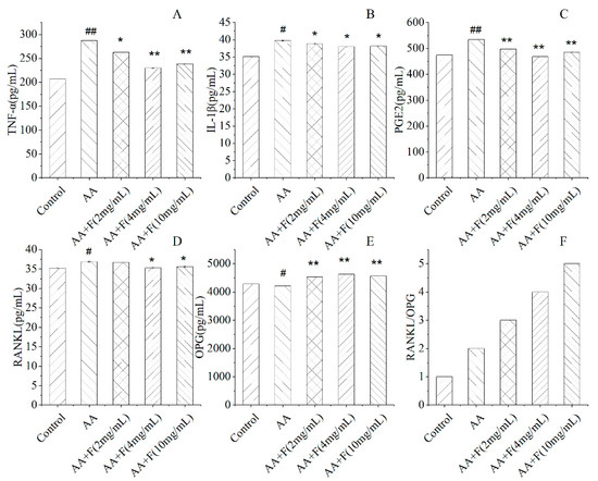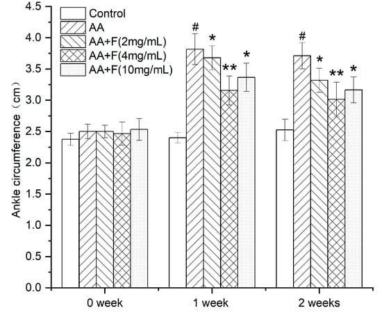 Effects of different treatments on reducing ankle joint circumference of arthritic rats (x ± SD). Error bars represent standard deviations (n = 6). As compared with control group, # p < 0.05 indicates the arthritis model was established successfully. As compared with the AA group, * p < 0.05 indicates significant effects of AA+F (2 mg/mL) and AA+F (10 mg/mL) treatments in alleviating ankle joint swelling in arthritic rats; ** p < 0.01 indicates a more significant effect of AA+F (4 mg/mL) in reducing ankle joint circumference of arthritic rats.