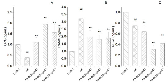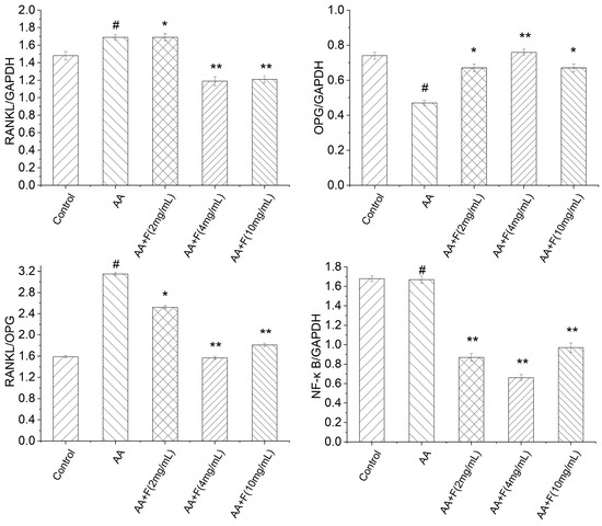 Expression of OPG, RANKL, NF-κB proteins as detected via Western blot analysis (x ± SD). Error bars represent standard deviations (n = 3). As compared with the control group, # p < 0.05 indicated that the arthritis model (AA) group was established successfully, as evidenced by decreased expression of OPG and NF-κB proteins and increased expression of RANKL protein in the AA group. As compared with the AA group, * p < 0.05 and ** p < 0.01 indicated that extract-treated arthritis model (AA+F) groups exhibited increased expression of OPG protein and decreased expression of RANKL protein and significant inhibition of the NF-κB pathway.