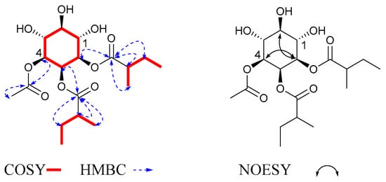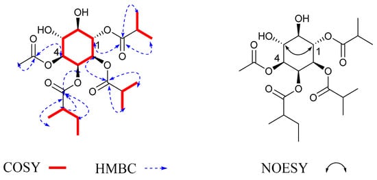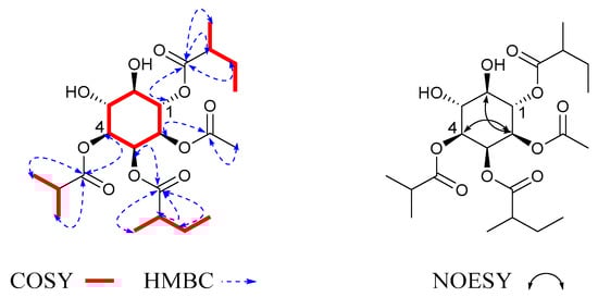 Compound 6 was obtained as a colorless solid. Its molecular formula, C18H30O9, was determined by positive HR-ESI-MS at m/z 408.2228 [M + NH4]+ (calcd. 408.2234) with four degrees of unsaturation. The NMR data of 6 were similar to those of 1, which meant that they had a similar cyclohexane structure. In 1H-1H COSY and HMBC (Figure 5), the correlation from H-2 to C-2MB indicated that the 2MB was attached to C-2; the correlation from H-3 to C-2MB′ indicated that the 2MB′ was attached to C-3; the correlation from H-4 to C-Ac indicated that the Ac was attached to C-4. The NOESY (Figure 5) correlations demonstrated that the relative configurations of H-2/H-4 and H-6 were determined as β. Based on the above 1H NMR and 13C NMR spectrum data, the structure of compound 6 was similar to that of 1β-acetate 2α-methybutanoate 3α-methybutanoate, except for the relative configuration []. Through the analysis of the compound, it was found that the configuration of the fourth position of the compound was opposite. Therefore, compound 6 was myoinositol-2,3-(2-methylbutyrate)-4-acetate, and was named solsurinositol F.
