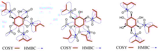 Compound 3 was obtained as a colorless solid. Its molecular formula, C25H40O11, was determined by positive HR-ESI-MS at m/z 534.2916 [M + NH4]+ (calcd. 534.2914) with six degrees of unsaturation. The NMR data of 3 were similar to those of 1 (Table 1 and Table 2), which meant that they had the same cyclohexane structure. The main difference was the substituent patterns of the inositol ring. Through 1H-1H COSY and HMBC (Figure 4) spectra, the correlation from H-1 to C-Ac indicated that the Ac was attached to C-1; the correlation from H-2 to C-2MB indicated that the 2MB was attached to C-2; the correlation from H-3 to C-2MB′ indicated that the 2MB′ was attached to C-3; the correlation from H-4 to C-Ac′ indicated that the Ac′ was attached to C-4; the correlation from H-5 to C-2MB″ indicated that the 2MB″ was attached to C-5. The relative configuration was determined by the same method as that used for 1. The configurations of H-1 at δH 5.41 (1H, td, J = 10.0, 5.2 Hz) and H-5 at δH 5.41 (1H, td, J = 10.0, 5.2 Hz) were defined by coupling constant as β. Therefore, compound 3 was determined to be myoinositol-1,4-acetate-2,3,5-(2-methylbutyrate), and was named solsurinositol C.
