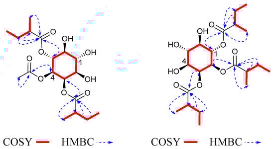 Compound 5 was obtained as a colorless solid. Its molecular formula, C21H36O9, was determined by positive HR-ESI-MS at m/z 433.2424 [M + H]+ (calcd. 433.2438) with four degrees of unsaturation. 1H and 13C NMR spectra were close to compound 1 with the presence of one cyclohexane structure. The main difference was the substituent pattern and number. In 1H-1H COSY and HMBC (Figure 4) spectra, the correlation from H-2 to C-2MB indicated that the 2MB was attached to C-2; the correlation from H-3 to C-2MB′ indicated that the 2MB′ was attached to C-3; the correlation from H-6 to C-2MB″ indicated that the 2MB″ was attached to C-6 []. The coupling patterns of six oxygenated methine protons were close to 1. Therefore, compound 5 was myoinositol-2,3,6-(2-methylbutyrate), and was named solsurinositol E.