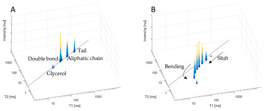 Chemical and morphological TD NMR sensor 2D T1-T2 relaxation times of linseed oil before (A) and after 120 h of thermal oxidation at 80 °C plus air pumping (B).