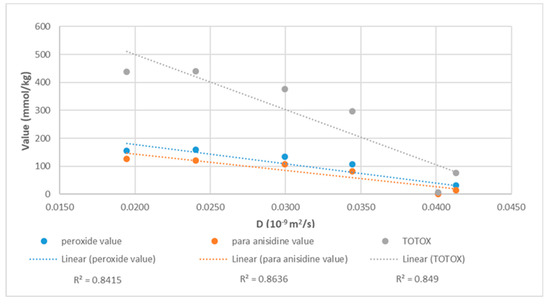Correlation between linseed oil self-diffusion (D) and PV/AV/TOTOX. Averages of 38 analyses for each point taken from the database (S1) were used.